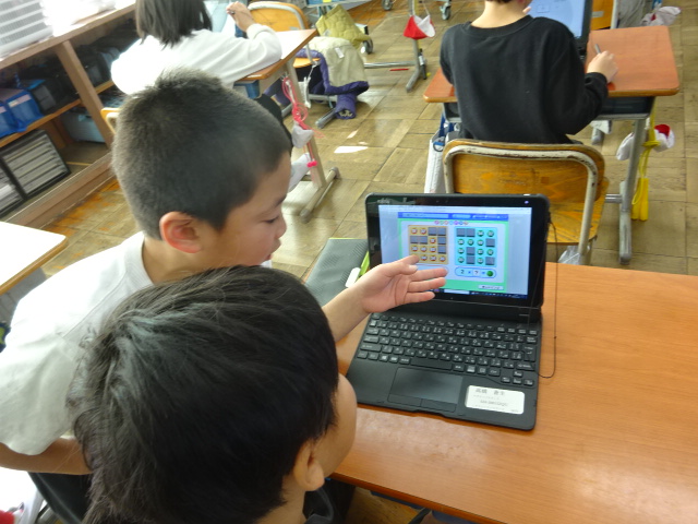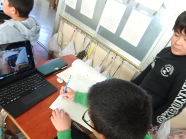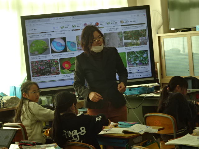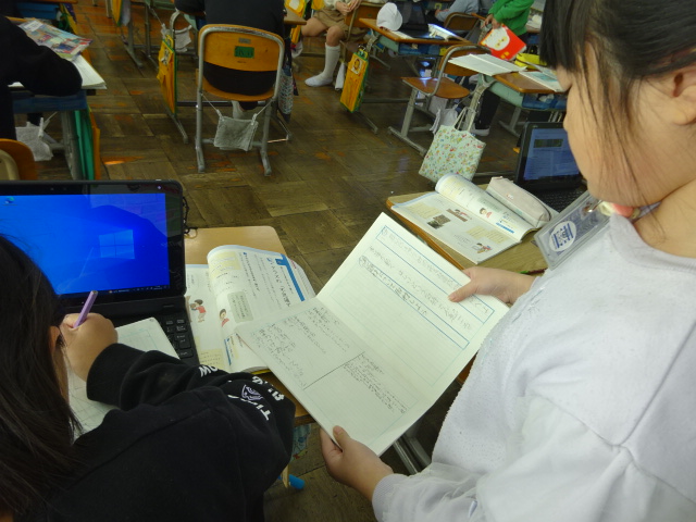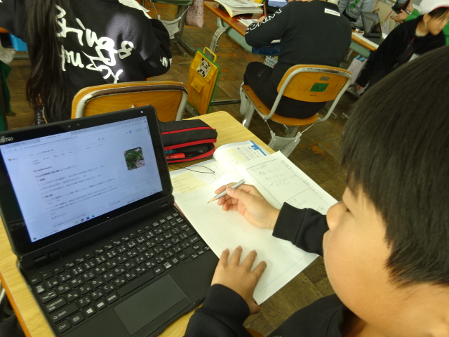 今日は2年生が、教えっこしながらドリルパークに挑戦です。みんな、自分のポイントを稼ぐために夢中になって取り組んでいました。「ぱちぱち上手に打てるようになりたい!」「うまく字が書けないんだ・・・」いろいろな不具合や難しさを1つずつ乗り越える姿に成長を感じています。4年生は国語の学習で木の写真を撮って、検索したり、特徴を調べたりしていました。