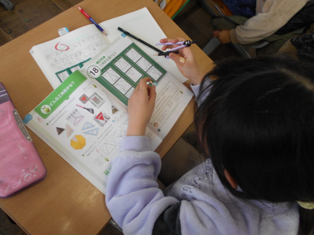 三角形の仲間分け 2026年2月24日 最終更新日時 : 2026年2月25日 kumagaya_edit 3年生では三角形を仲間分けをする勉強をしました。 三角形の辺や角などに注目してどの三角形が仲間か調べました。 定規やコンパスを使って辺の長さにひみつがあることに気がつきました。