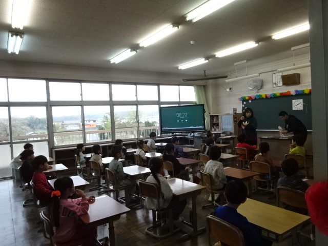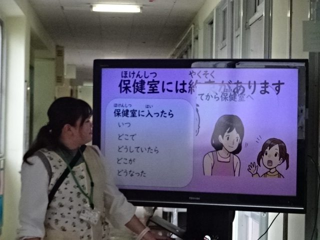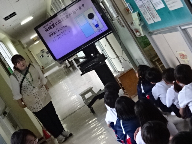 1年生の保護者の皆さん。ちゃんとやれてます!新しい支援員の先生です。保健室の先生からは保健室の約束を聞きました。