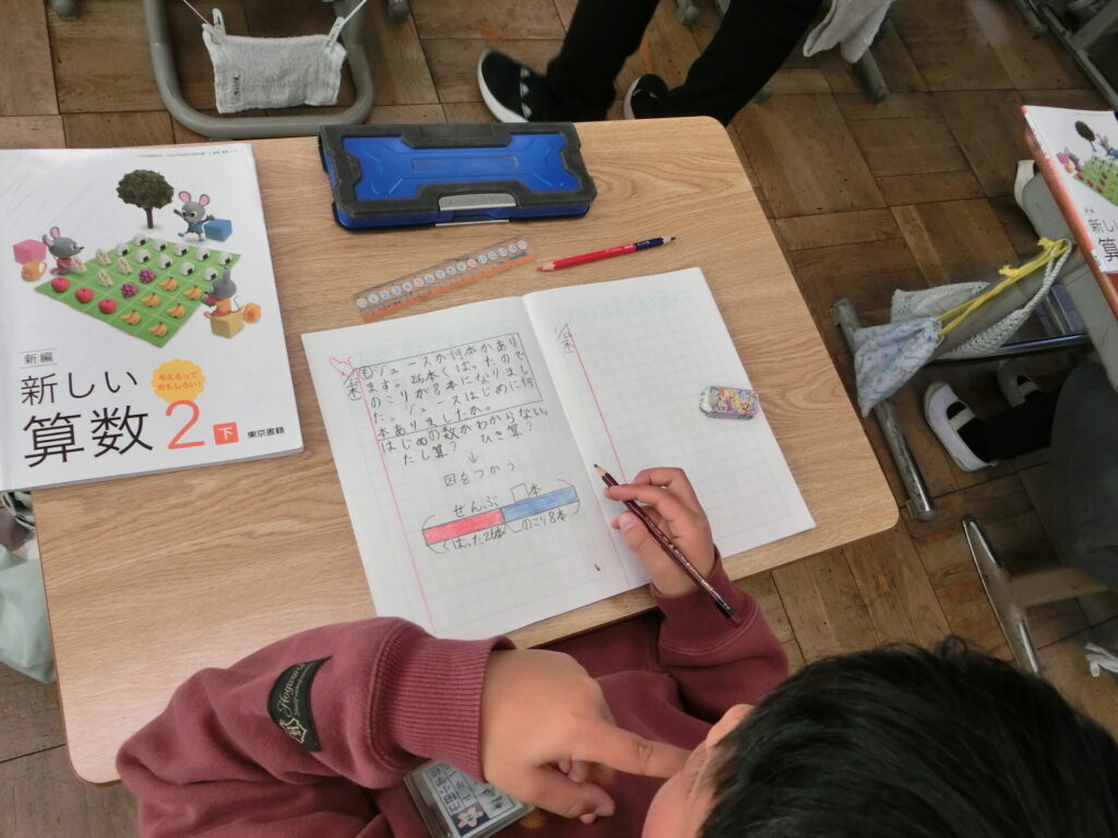 2年生 算数授業 2026年1月22日 最終更新日時 : 2026年1月22日 kumagaya_contribute 市田小学校の学校研究の一環で、2年生の授業を全職員で参観しました。2年生の子どもたちは、問題の答えを確かめるために、図に表す学習をしています。先生の話をよく聞いて、ノートに書いたり発表したり、どの子もがんばりました。