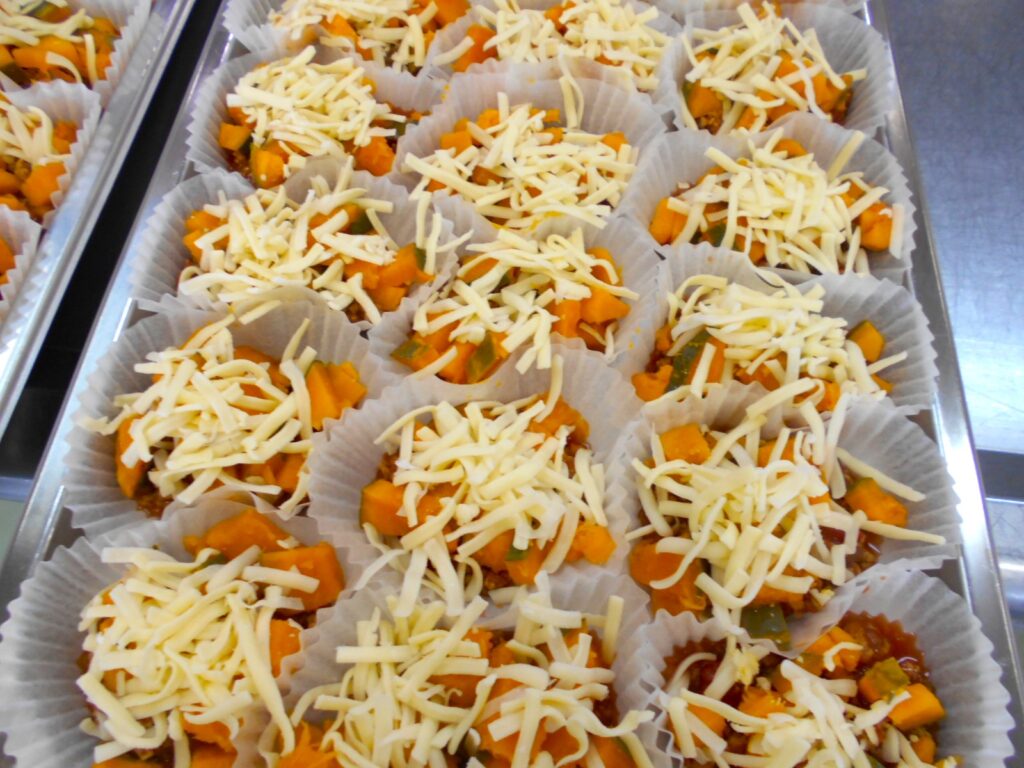 ラグビーかぼちゃのミートソースグラタン にんじんきゅうりサラダ くまがやマドレーヌ です。