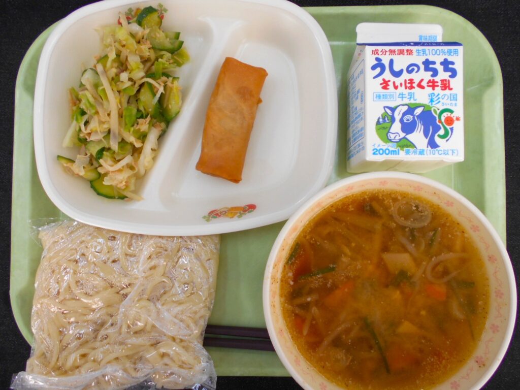 11/28 今日の給食 2025年11月28日 最終更新日時 : 2025年11月28日 kumagaya_author ~今日の給食~ 牛乳 中華めん ごまみそラーメンスープ 春巻き ヘルシーサラダ です。