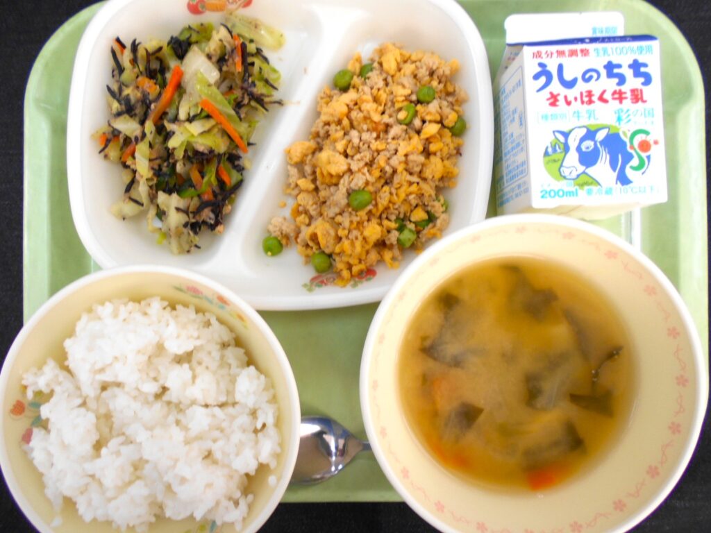 2/2 今日の給食 2026年2月2日 最終更新日時 : 2026年2月2日 kumagaya_author ~今日の給食~ 牛乳 ごはん 豆腐とわかめの味噌汁 三色そぼろご飯の具 ツナとひじきのサラダ です。 そぼろご飯の具には、グリンピースが入っていますが、苦手な子も挑戦して食べてくれていました!