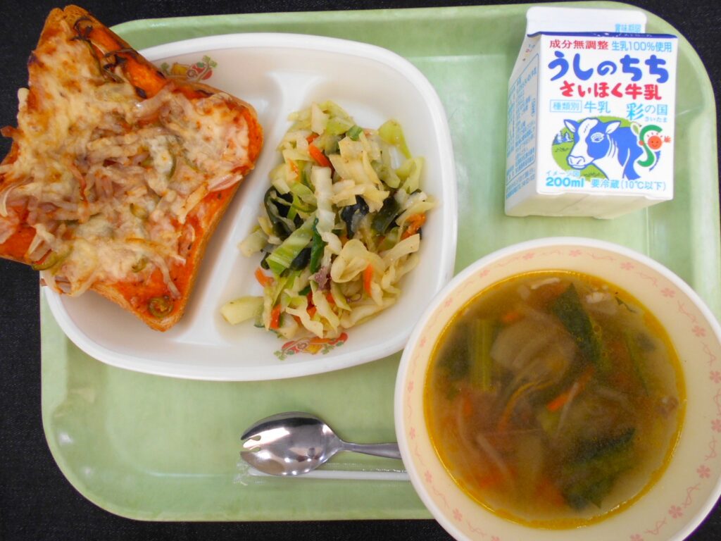 2/5 今日の給食 2026年2月5日 最終更新日時 : 2026年2月5日 kumagaya_author ~今日の給食~ 牛乳 ピザトースト オニオンスープ 海藻サラダ です。 今日は、新メニューのピザトーストでした。 1枚1枚ソースを塗り、具材を乗せて焼き上げました。 手間と時間をかけたメニューだったので、残食ゼロ、とても嬉しかったです!
