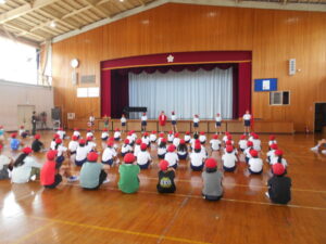 赤組、白組の全体の応援練習が始まりました。 どちらも大きな声で、相手の応援が聞こえるぐらい元気なかけ声が聞こえました。 あと2週間で運動会です。赤組、白組どちらもがんばれ!!