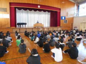 3~6年生は、書き初めの練習が始まっています。6年生が書く文字は、「出発の日」です。お手本をよく見て、集中して臨んでいます。